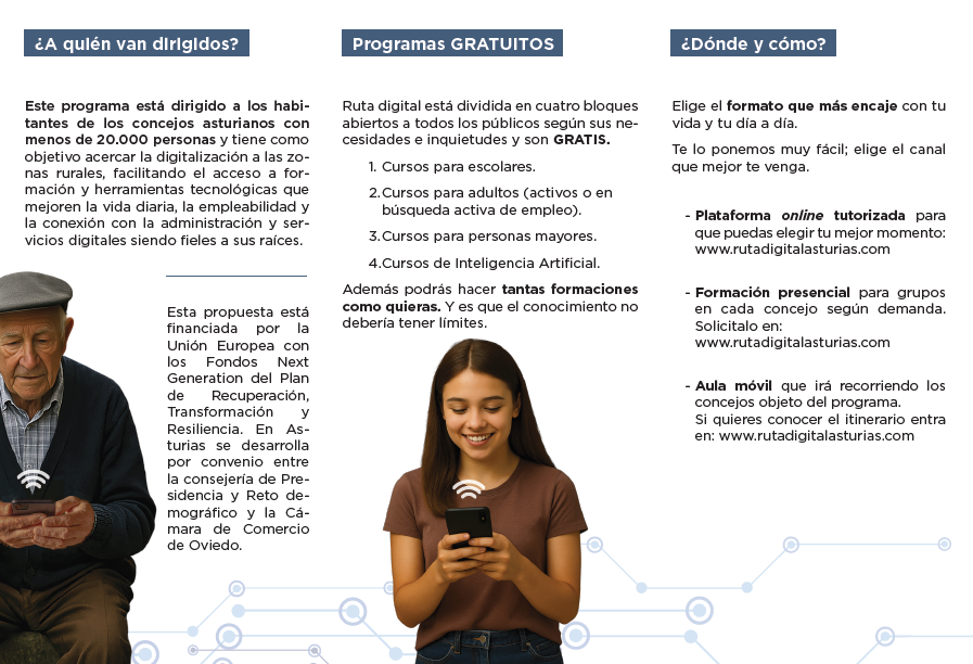 Se trata de una oferta formativa con 100 micro píldoras de 7,5 horas cada una, gratuitas y para todos los públicos. Desde formación básica de manejo de dispositivos y seguridad o prevención del ciberbullying, hasta presentaciones de trabajos escolares, música, comercio digital o inteligencia artificial pasando por herramientas imprescindibles para relacionarse con las administraciones (certificado digital, cita previa) o propuestas de ocio y entretenimiento online (redes sociales, viajes…) Y se pueden hacer cuantos cursos se quiera de toda la oferta que está agrupada en cuatro bloques abiertos a todos los públicos según sus inquietudes.