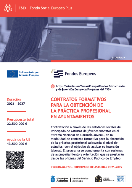 Se informa de que el Contrato en Prácticas 2025 - 2026 que se desarrolla en este Ayuntamiento está financiado por el Servicio Público de Empleo del Principado de Asturias y por el Servicio Público de Empleo Estatal. RESOLUCIÓN del Servicio Público de Empleo del Principado de Asturias de 10 de octubre de 2025 (BOPA de 20 de octubre) de concesión de subvenciones a ayuntamientos del Principado de Asturias con destino a la celebración de contratos formativos para la adquisición de la práctica profesional adecuada al nivel de estudios.