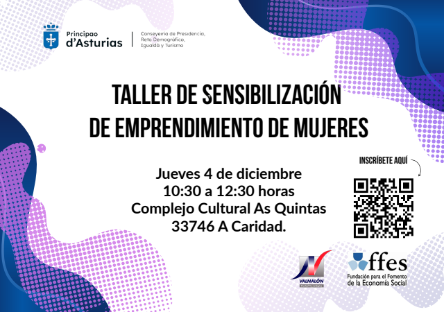 Una iniciativa de la Dirección General de Igualdad del Principado de Asturias dirigida a mujeres con interés por el emprendimiento, que se va a desarrollar en el Complejo Cultural As Quintas de A Caridá el jueves 4 de diciembre de 2025 en horario de 10:30 h a 12:30 h con la colaboración de Ciudad Industrial del Valle del Nalón, S.A.U. (Valnalón) y la Fundación para el Fomento de la Economía Social (FFES).